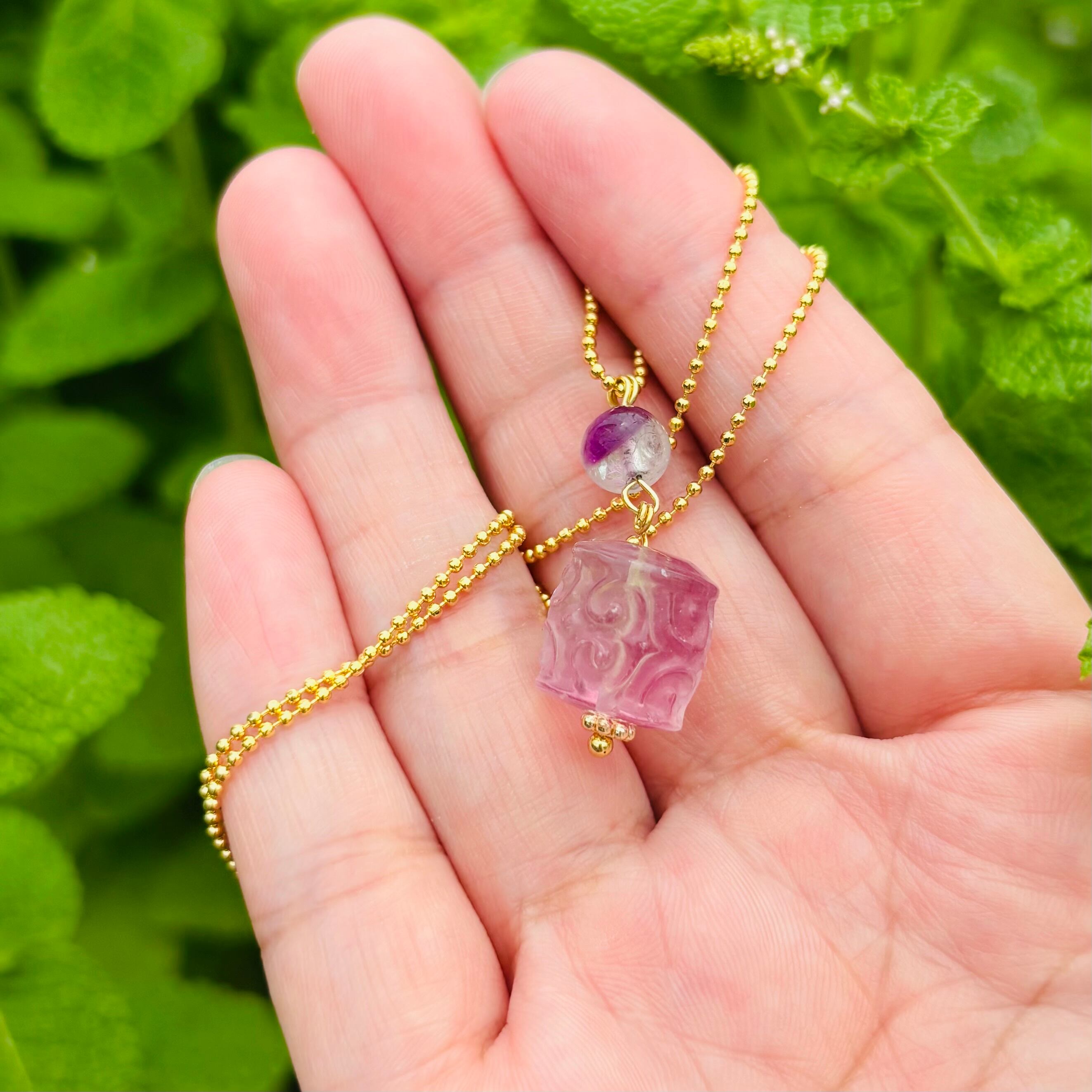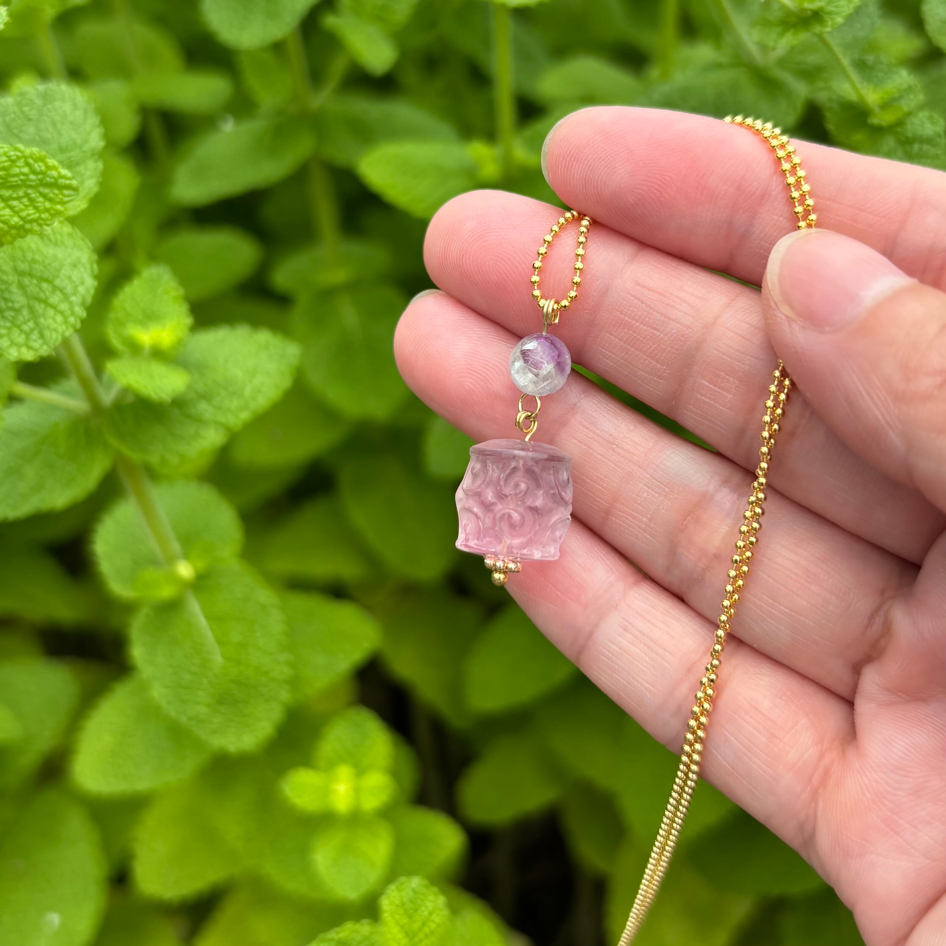 マニ車の上の丸玉は、エンゼルフェザーフローライトを使っています。