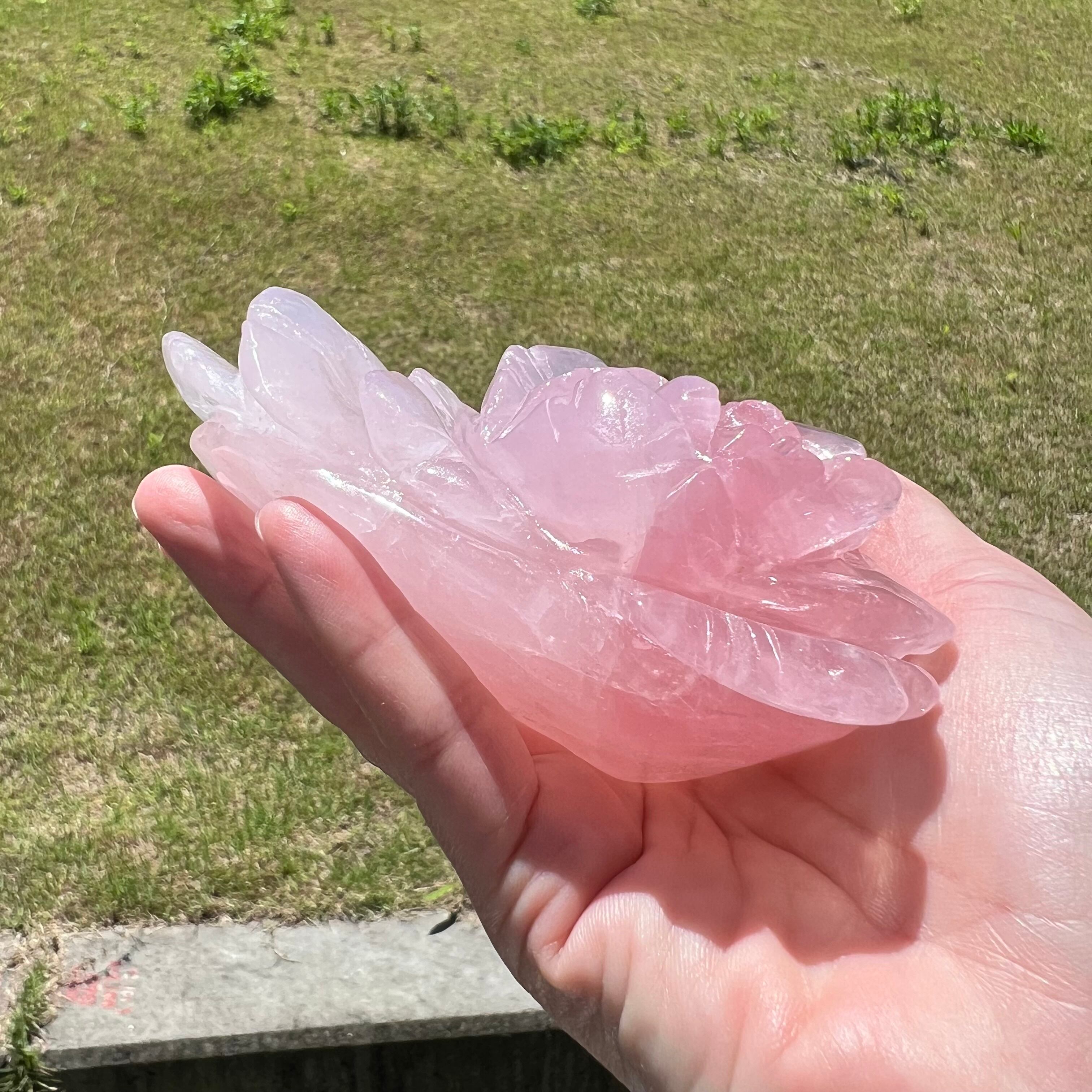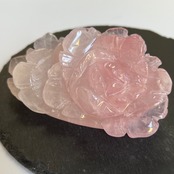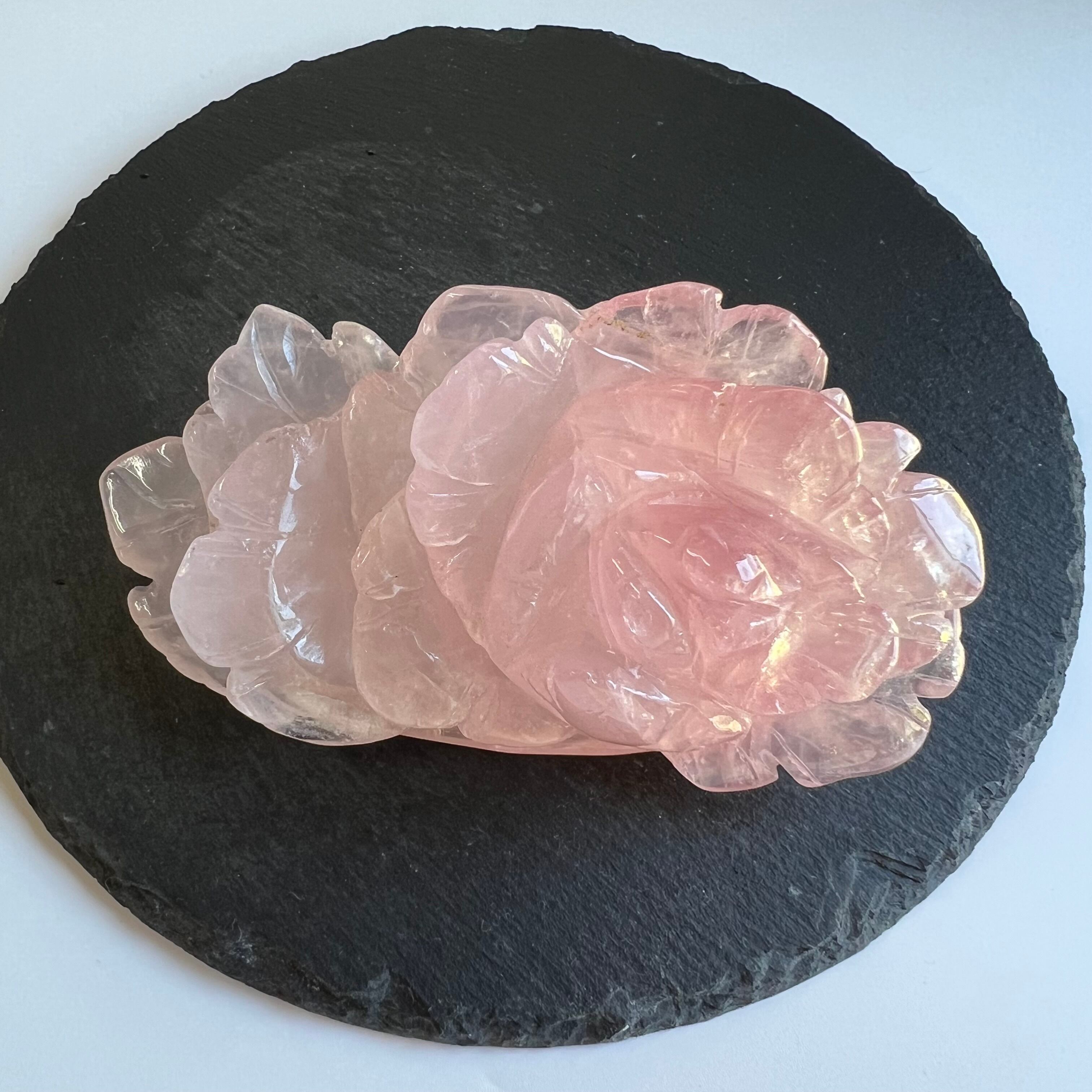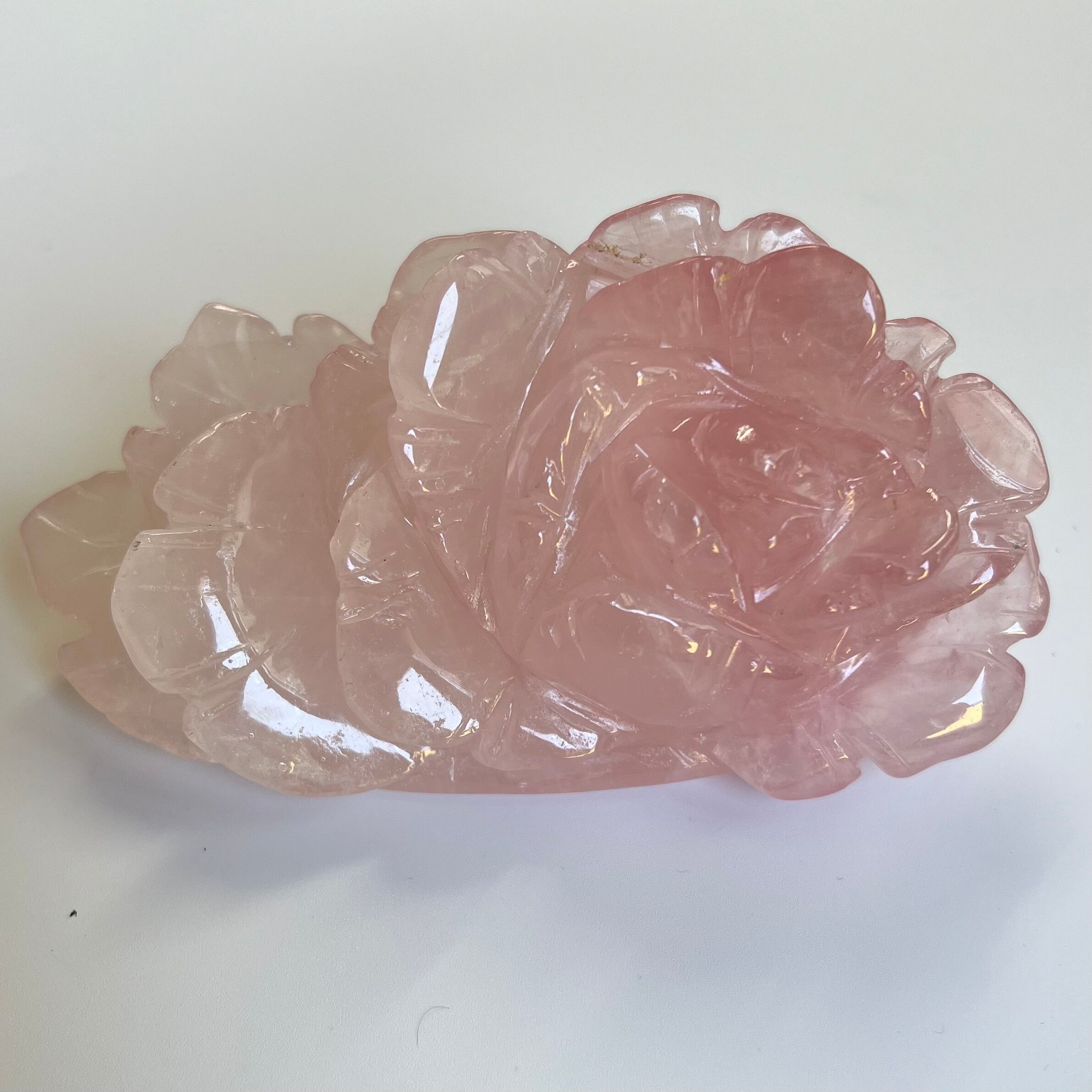 上品で優雅な雰囲気を演出する、ローズクォーツのバラの彫りものの置物です。