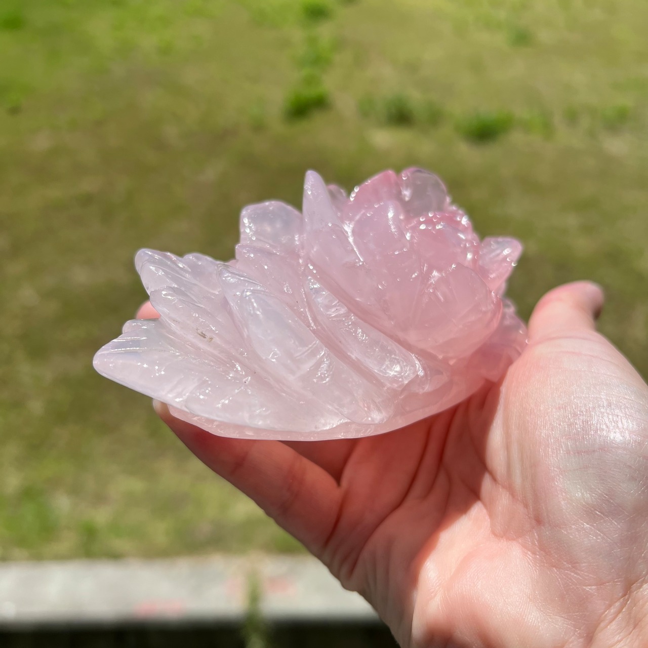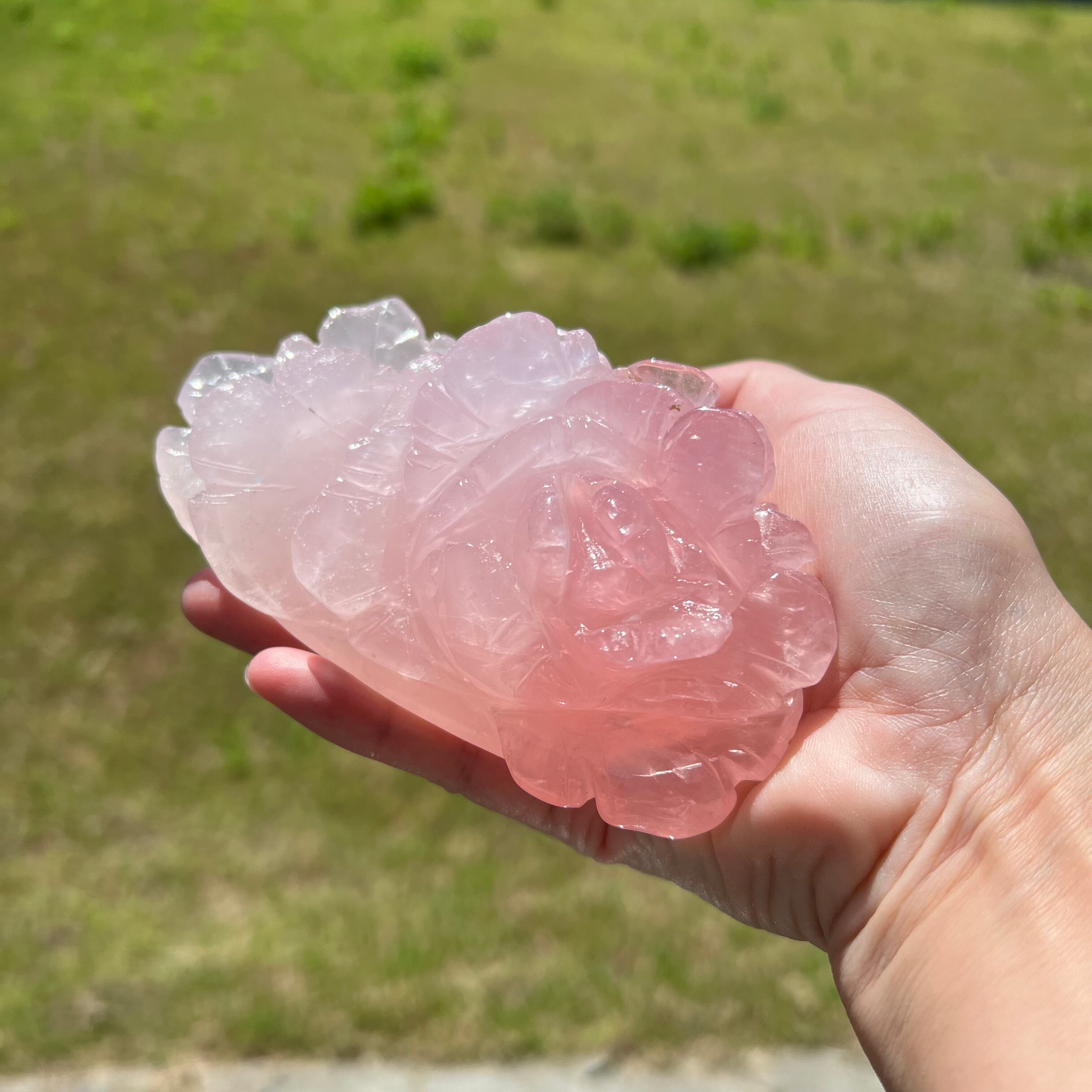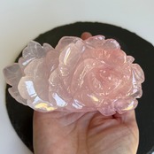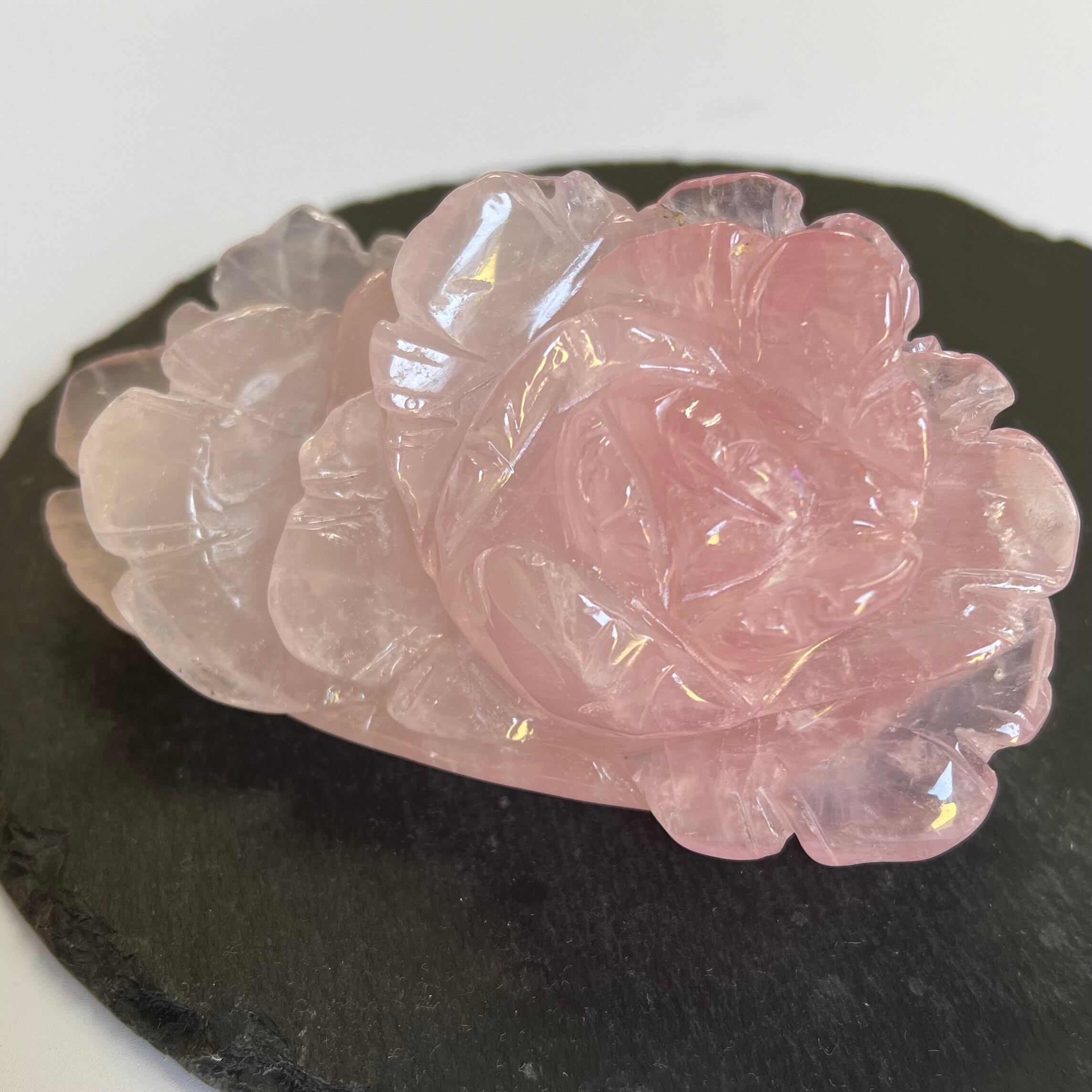 上品で優雅な雰囲気を演出する、ローズクォーツのバラの彫りものの置物です。